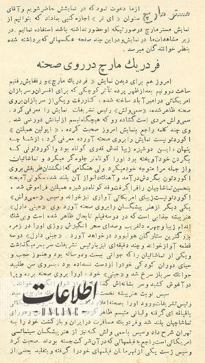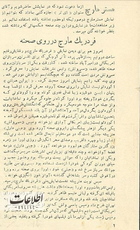 هشتاد سال قبل، پادگان نیروهای آمریکایی در امیرآباد تهران میزبان فردریک مارچ بود. روزنامه اطلاعات ۲۵ آبان ۱۳۲۲ آگهی هفته نامه هولیوود را منتشر کرده که در آن اخبار و عکسهای حضور فردریک مارچ در تهران منتشر شده است. عکسها را تماشا کنید و گزارش را از شماره ۷ هفته نامه هولیوود بخوانید.
