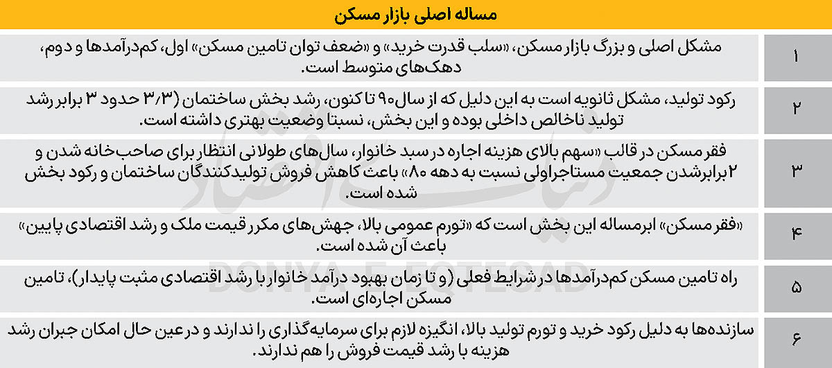 پیشتر اما، طراحان همیشگی «مسکنسازی دولتی» مطرح کرده بودند، رکود تولید و سرمایهگذاری مسکن در سالهای اخیر باعث «دور از دسترس شدن خانه برای گروههای کمدرآمد» شد. این گروه، ارتباطی بین وضعیت اقتصاد کلان و شرایط غیراقتصادی با قفلهای بخش مسکن و ساختمان قائل نیست و تاکید دارد، «افزایش نبض عرضه» میتواند حال تقاضای مصرفی مسکن را خوب کند.