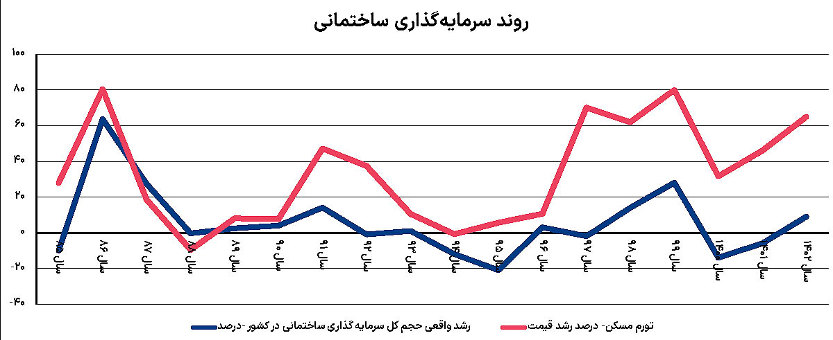 تصویر سوم که متهم دیگری غیر از «رشد اقتصادی پایین» را معرفی میکند، مربوط به روند سرمایهگذاری ساختمانی است.