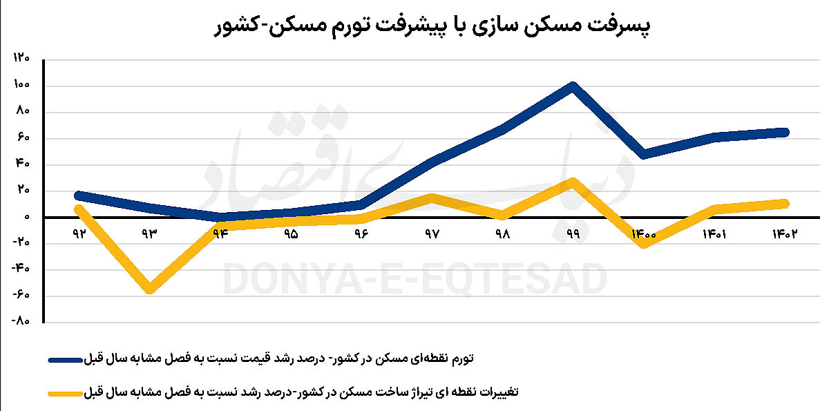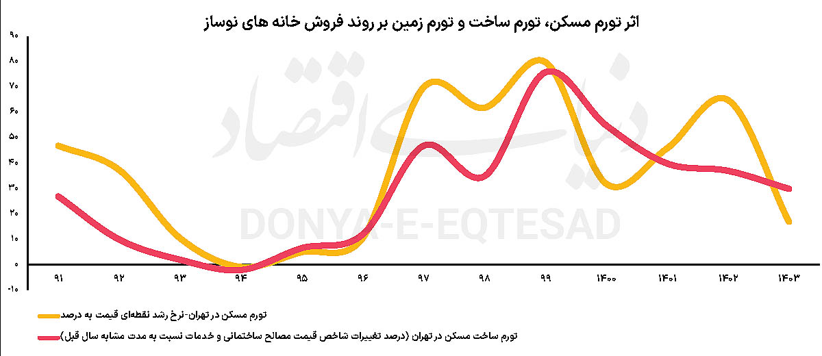 حجم سرمایهگذاری ساختمانی طی ابتدای دهه 90 تا سال 1402، سالانه بهطور متوسط 1.3 درصد افزایش پیدا کرده در حالی که میانگین تورم مسکن در همین فاصله 36 درصد و تورم تولید نیز 28 درصد بوده است. این ارقام میگوید، جهش قیمت مسکن و رکود خرید مصرفی باعث کاهش انگیزه تولید ساختمان شد و در سالهای اخیر جهش تورم تولید ساختمان نیز شرایط سرمایهگذاری را سختتر کرد.