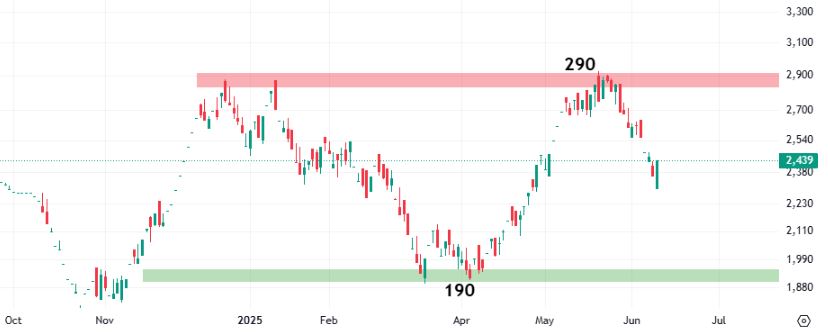 نماد “ثمسکن” طی هفت ماه گذشته در یک روند خنثی مستطیلی با نوسان قیمتی ۵۰ درصدی معامله شده است. در این بازه، ۱۹۰ تومان نقش کف حمایتی و ۲۹۰ تومان سقف مقاومتی را ایفا میکند.