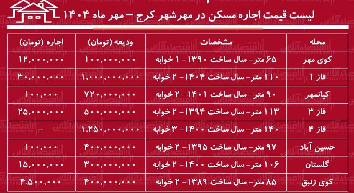 به گزارش ساختمان آنلاین به نقل از طبق بررسیهای میدانی از بازار مسکن کرج قیمت اجاره مسکن در مهرشهر کرج به شرح زیر است: