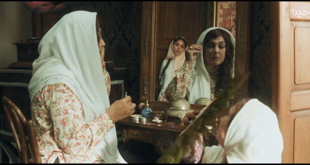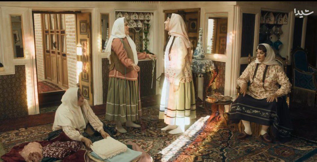 در این صحنه فضایی از یک خانه اشرافی ایرانی در دوره قاجار به تصویر کشیده شده است. اتاق با فرشهای دستباف رنگارنگ، دیوارهای گچبریشده و آینهکاریهای ظریف آراسته شده و مبلمان سنتی با روکش مخملی جلوهای مجلل به فضا داده است.
