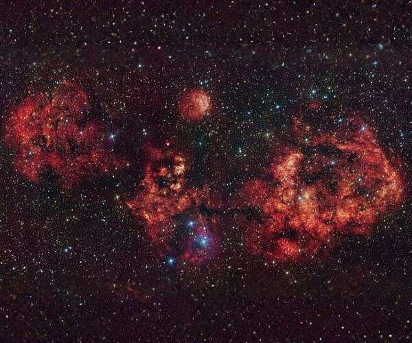 اخترشناسان، ابری چشمگیر از گاز و غبار به شکل خفاش را در بالای سایت پارانال رصدخانه جنوبی اروپا در شیلی رصد کردند. درست در شب هالووین این خفاش کیهانی توسط تلسکوپ نقشهبرداری VLT تصویربرداری شده است که میدان دید گسترده آن، سحابیای به وسعت 4ماه کامل را نشان میدهد. این سحابی که تقریبا 10هزار سال نوری از ما فاصله دارد، بین صورتهای فلکی جنوبی سیرسینوس و گونیا قرار دارد. این سحابی مانند یک پرورشگاه ستارهای عمل میکند و ستارگان جدید را به دنیا میآورد. رشتههای متراکم درون این ساختار شبیه اسکلت است و مناطقی از گاز و غبار سردتر و متراکمتر را نشان میدهد که نور ستارگان پسزمینه را مبهم میکند.