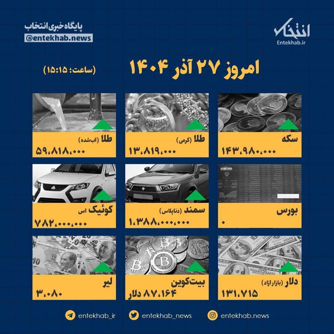 سکه امامی ۱۴۳ میلیون و ۹۸۰ هزار تومان / هر گرم طلای ۱۸ عیار ۱۳ میلیون و ۸۱۹ هزار تومان / خودروی دنا پلاس یک میلیارد و ۳۸۸ میلیون تومان / خودروی کوئیک ۷۸۲ میلیون تومان